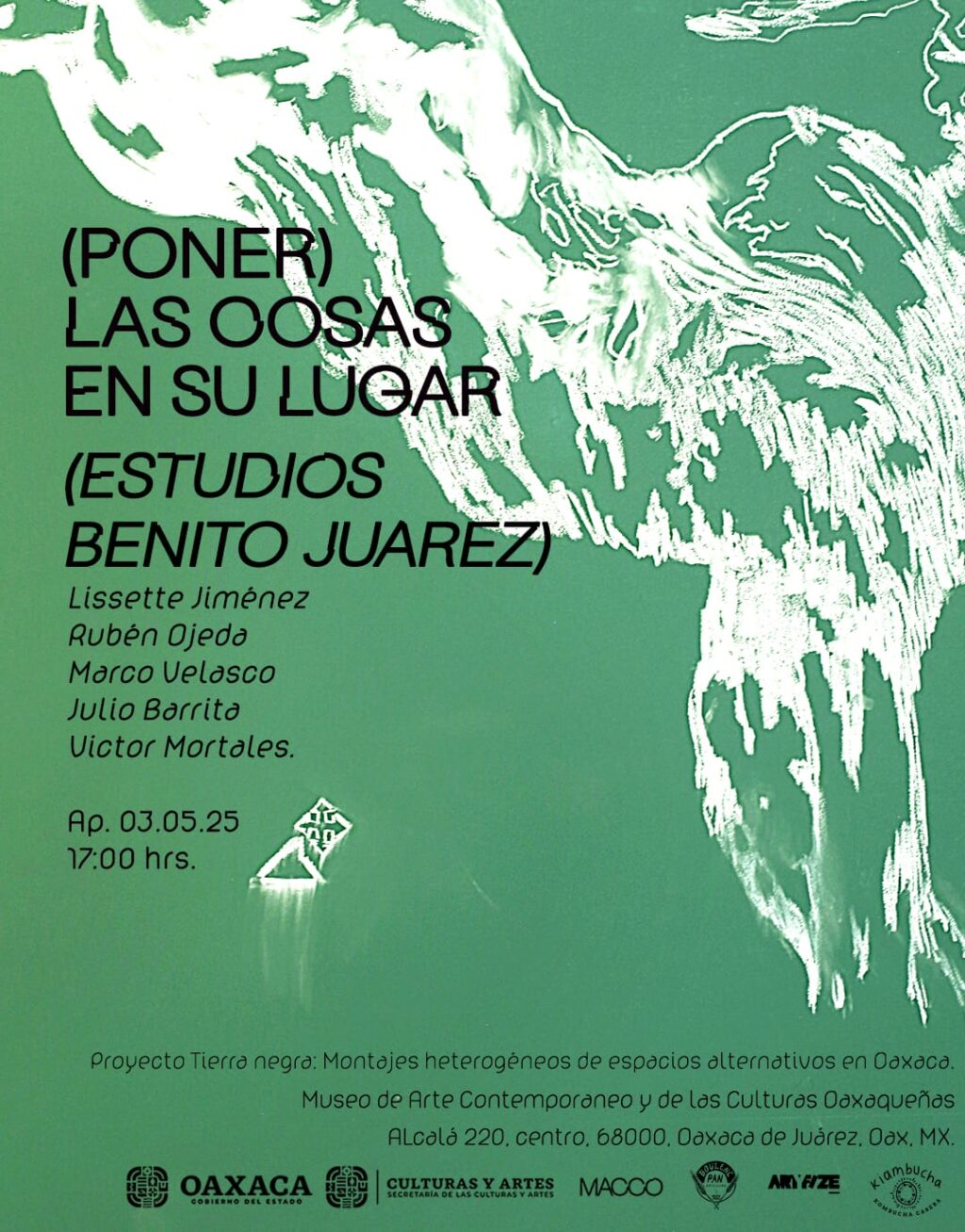 El grupo Estudios Benito Juárez presenta su nueva exposición colectiva: «(Poner) las cosas en su lugar», una muestra que reúne tanto trabajos individuales como proyectos colaborativos desarrollados desde 2017. La inauguración será el sábado 3 de mayo a las 17:00 horas, en el Museo de Arte Contemporáneo y de las Culturas Oaxaqueñas (MACCO), en el corazón de Oaxaca.